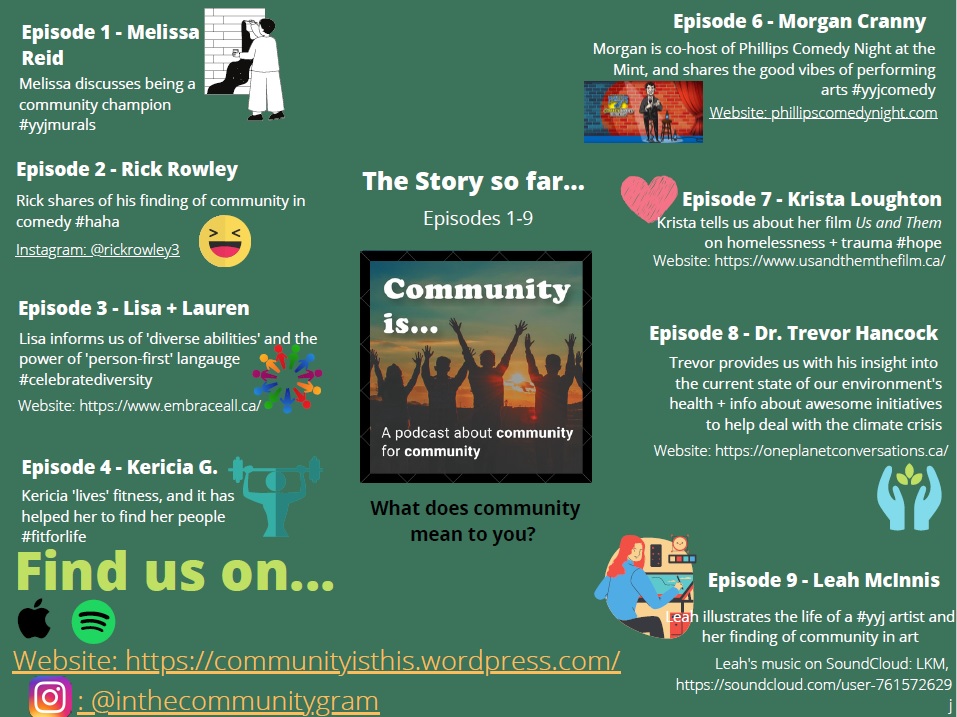 Media Links to Podcast providers and other community initiatives can be found here: Apple Podcasts Spotify Facebook Instagram YouTube Channel Check out our latest episodes in the feed: Goat Yoga #forthewin! Chatting with VI GogaWAG EM' DOWN: Hazel's Ice Cream #yyj family business#YYJ Musician Sean Lyons of Wet Future BandSaskia Says: multisport coaching + community with Saskia B.In the Community: Dallas Beach Share this: Click to share on X (Opens in new window) X Click to share on Facebook (Opens in new window) Facebook Like Loading...